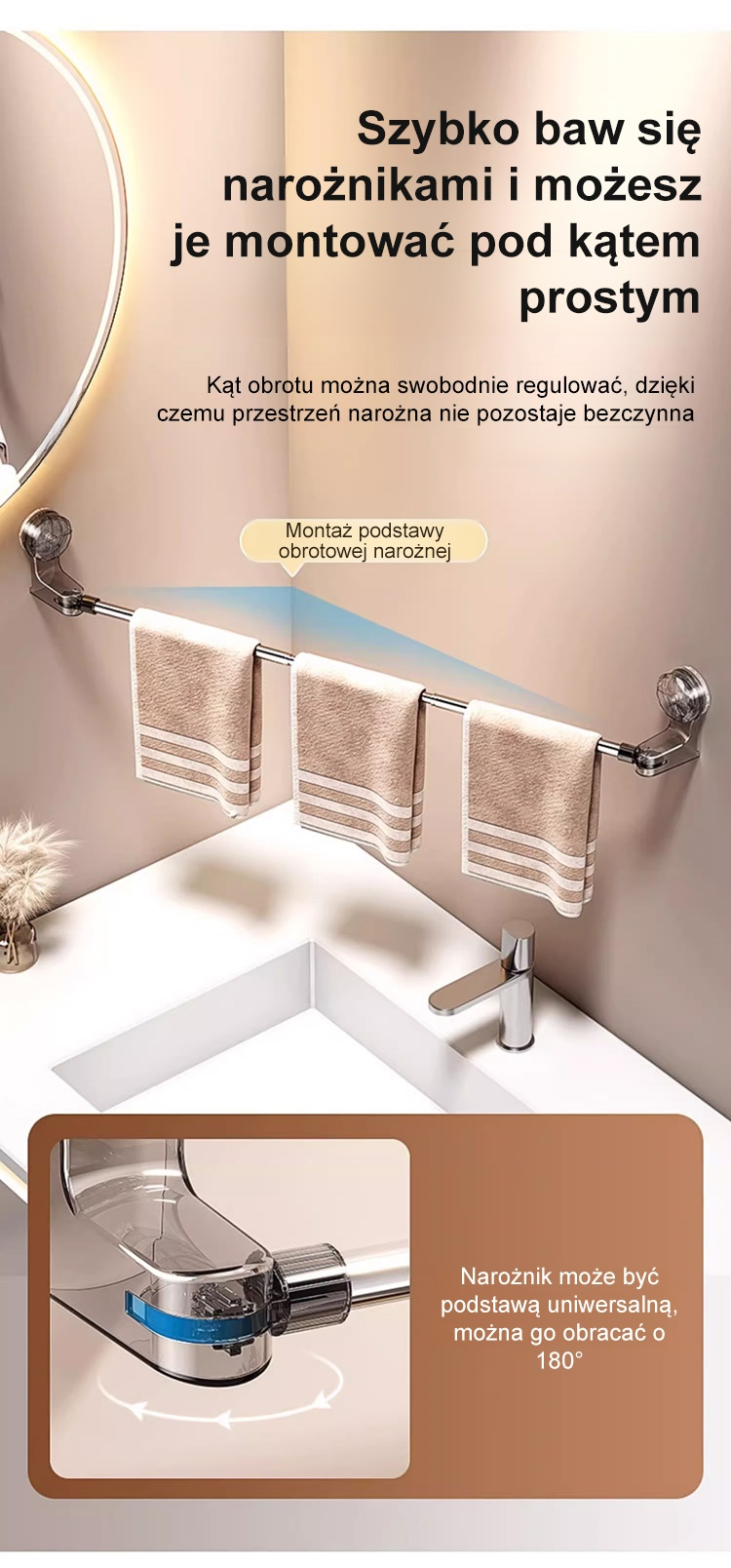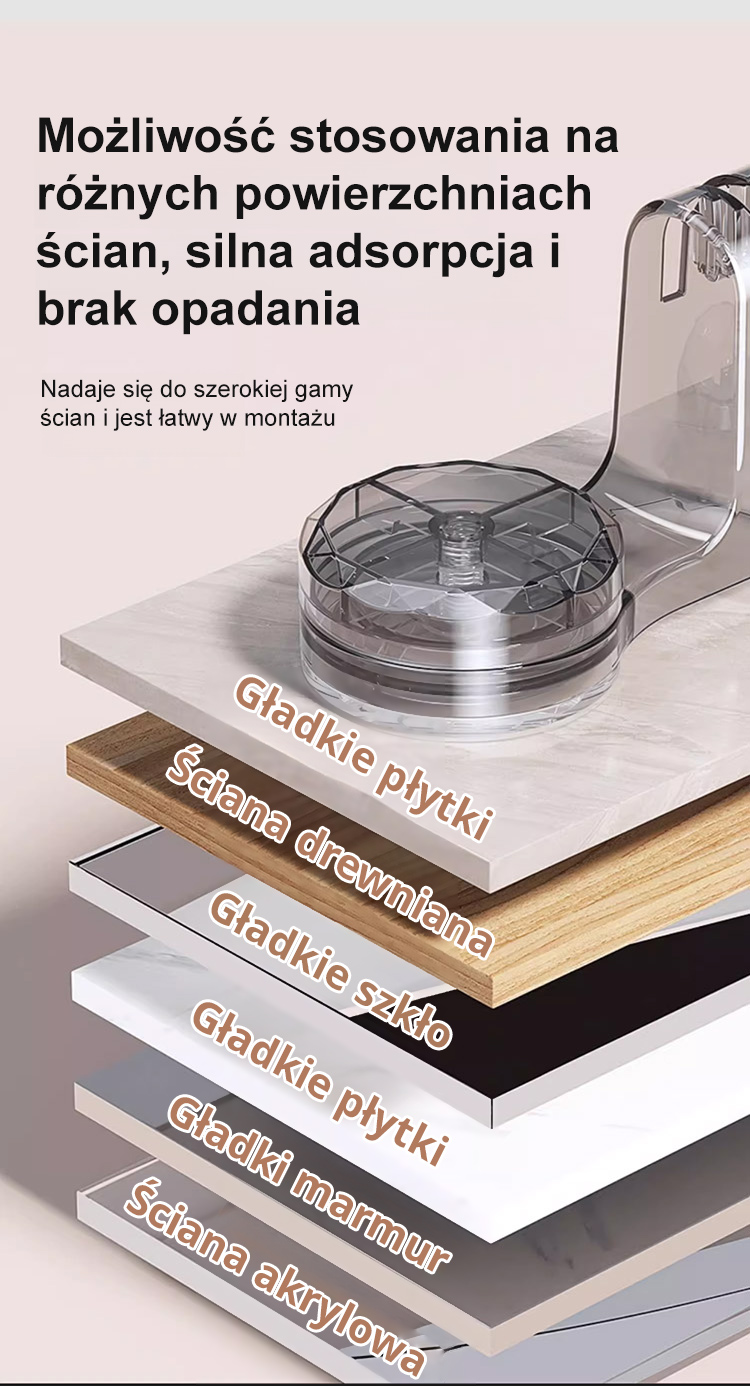 Regulowana długość, którą można bezpiecznie zamontować na gładkich powierzchniach, takich jak płytki, szkło i metal. Idealna do łazienki, kuchni i szaf.